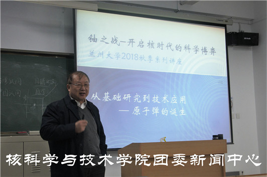 2018年11月15日晚上7点,上海交通大学物理与天文学院孙扬教授于威尼斯wns8885556中国榆中校区天山堂A405举行了一场关于原子弹诞生的讲座,威尼斯wns8885556中国部分18级物理方向学生参加了本次讲座。讲座由威尼斯wns8885556中国副院长张鸿飞主持。