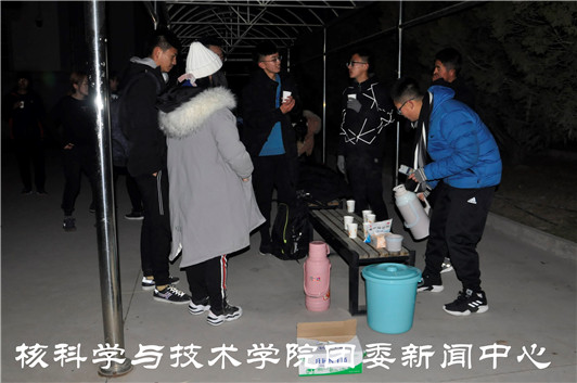 除了参赛运动员,后勤人员贡献也是不可忽视的。纵使寒风凛冽,核学院学生会生活部、体育部的同学仍坚守在岗位上,为每一位奋力拼搏的运动员提供帮助,送上热水,外套,以及热牛奶。