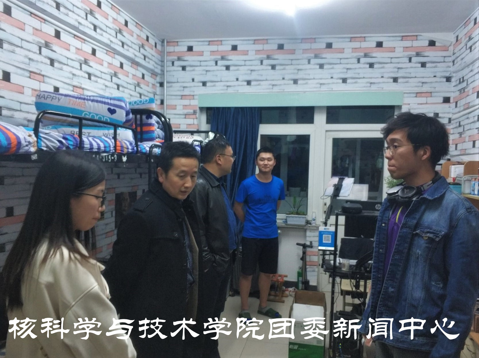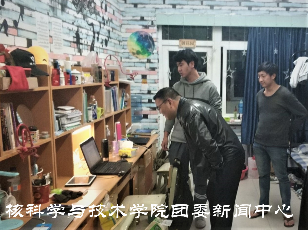 在辅导员肖连平的带领下,两位书记亲自走访了核学院的每一间宿舍,与每一位在宿舍的学生都进行了深入的交流。经肖连平老师的提醒,着重关心了部分降级学生的生活课业情况,并叮嘱他们要认真努力学习。在走访到去年宿舍文化节评定的优秀宿舍时,两位书记惊喜的发现其内部装饰仍然十分整齐美观,便祝愿他们再接再厉,将良好的宿舍环境保持下去。走访至四楼之后,由于原子核物理班当日晚有相关课程,本次走访到此便告一段落。