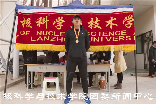 李宁浩同学领完奖牌跑回后勤处时,兴奋地与18级学长击掌,待他换下号码牌,稍事休息后,便开始和我分享他比赛的心路历程。据他描述,比赛时前两轮都是在第一跳时顺利通过,两轮后四十多个选手便只剩七名进入第三轮。在第三轮,有两名选手第一跳就跳过指定高度,而他由于发挥失误,在第二跳才获得晋级资格。这时来到了令人激动的三人角逐的决赛环节。那两名在上一轮有明显优势的选手在第四轮的三次机会中均未成功跳过。此时的李宁浩也已经两次跳跃失败,这就意味着,如果李宁浩同学第三次跳过便将获得该项目的冠军,没跳过便将与前两名失之交臂。在这个重要的时刻,他的内心有些紧张,但是想到已经可以拿到前三甲的名次,为核学院争光,便放松了心情。而也正是这种心无杂念的状态,使他完美发挥,不负众望,摘得桂冠。