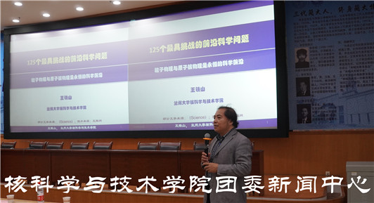 何源研究员以“绿色核能之梦”为题作了精彩报告。他指出,核能是清洁能源,在国家未来的发展中占据重要地位,并详细介绍了核电建设发展的前沿知识。王铁山教授就“最具挑战的125个前沿科学问题”做了整体介绍,并将晦涩难懂的物理知识与现实生活结合起来,形象生动,妙趣横生。